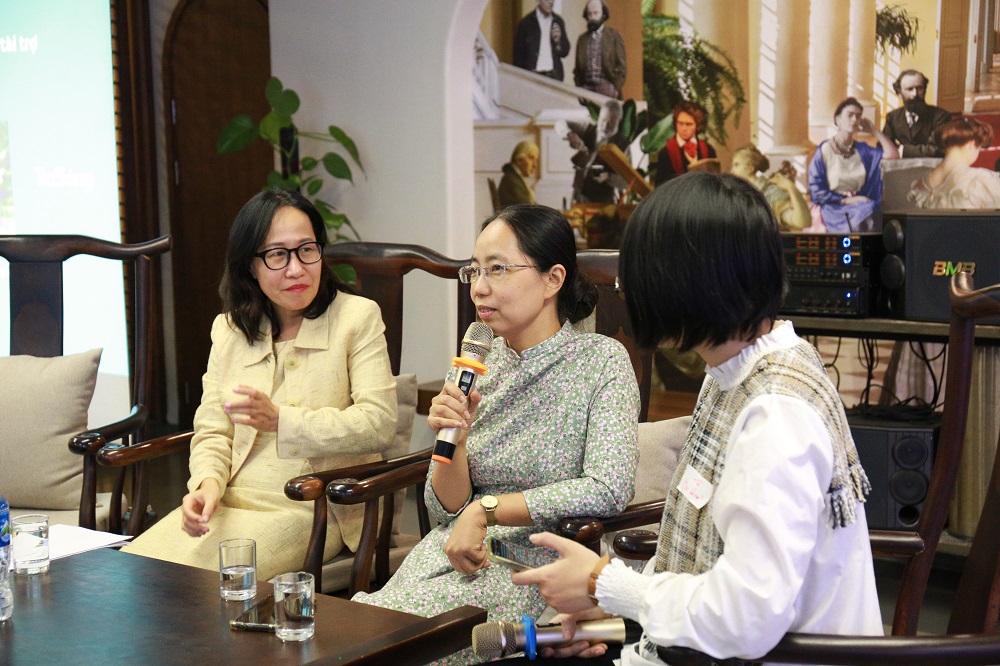 Chị Nguyễn Hương Thảo, Quản lý hợp phần Tài trợ Đổi mới sáng tạo của chương trình Aus4Innovation (trái) và chị Nguyễn Đặng Tuấn Minh, Giám đốc KisStartup (giữa) trao đổi về các cơ chế tài trợ tại tọa đàm “Tài trợ cho R&D và Đổi mới sáng tạo” ngày 27/11. Nguồn: Anh Thư/KHPT/Tia Sáng