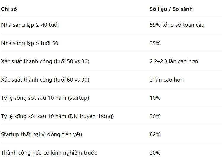 Các nghiên cứu quốc tế gần đây cho thấy, 59% nhà sáng lập startup toàn cầu hiện nay ở độ tuổi từ 40 trở lên, và độ tuổi trung bình của một nhà sáng lập startup thành công là 45 tuổi. Đặc biệt, người 50 tuổi có khả năng thành công cao gấp 2,2–2,8 lần, và người 60 tuổi có khả năng cao gấp 3 lần so với nhà sáng lập 30 tuổi (Harvard Business Review, 2018; Startup Magazine, 2024).