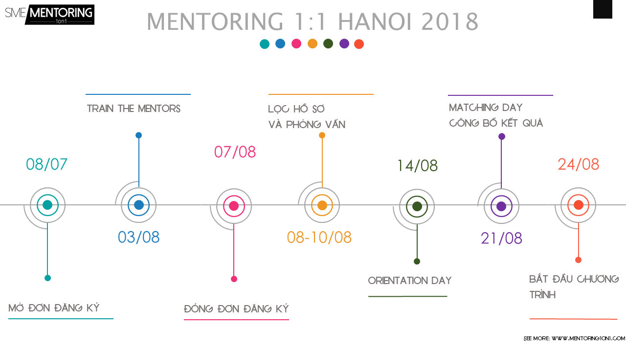 Nếu bạn còn đang thắc mắc về lộ trình SME Mentoring 1on1 tại Hà Nội sẽ diễn ra như thế nào thì hãy cùng chúng tôi xem infographic dưới đây để ghi nhớ vài mốc thời gian quan trọng trong đợt tuyển Mentor và Mentee mùa 2018-2019 này bạn nhé!