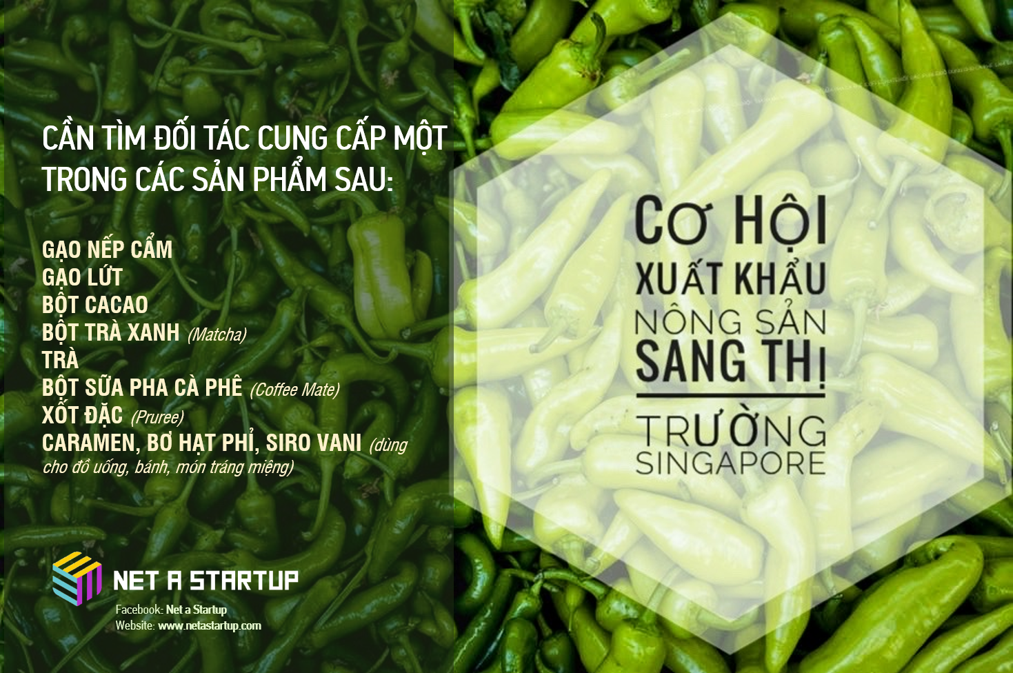Trong mạng lưới Net a Startup và CFBI, hiện nay chúng tôi đang có đối tác tại Singapore đang cần tìm đối tác có nhu cầu xuất khẩu nông sản sang thị trường Singapore thuộc các nhóm sau: